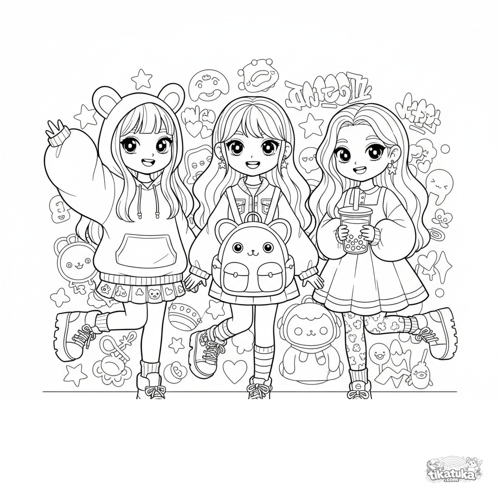 Coloring page for kids 7-12: a kawaii street fashion trio posing in front of a vibrant graffiti wall. A complex scene with detailed clothing and accessories.