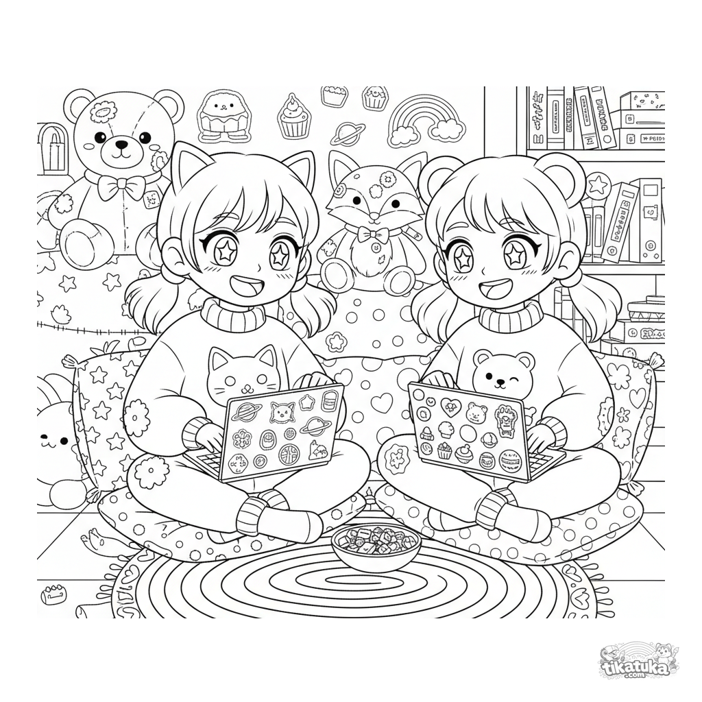 Coloring page for kids 10-12: two friends in a cozy basement nook decorating their laptops with stickers and keycaps in kawaii style. Plenty of cute details and accessories.