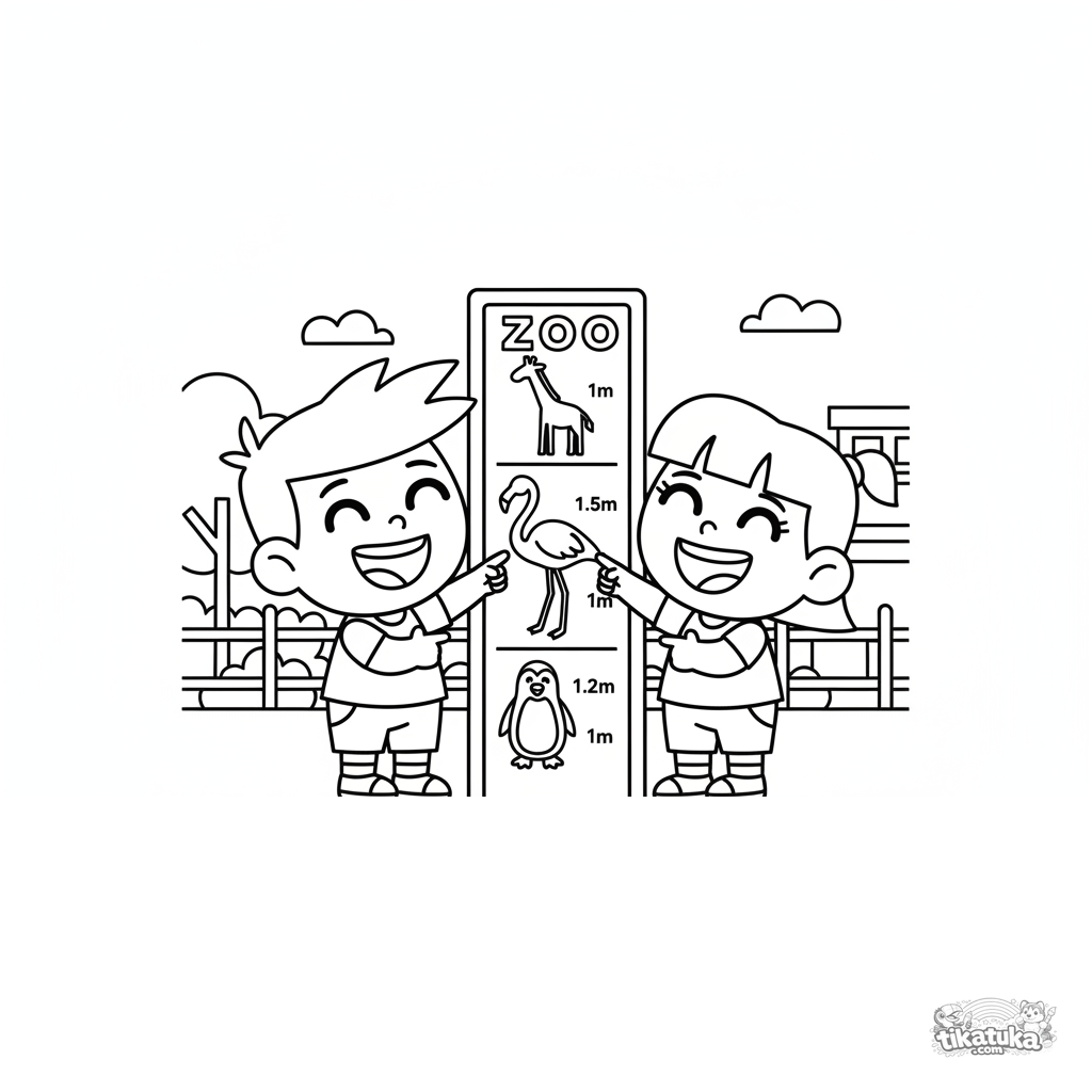 Coloring page for kids 7-9: two kids happily compare their height to animal sizes on a measurement chart at the zoo. Educational scene about comparing sizes.