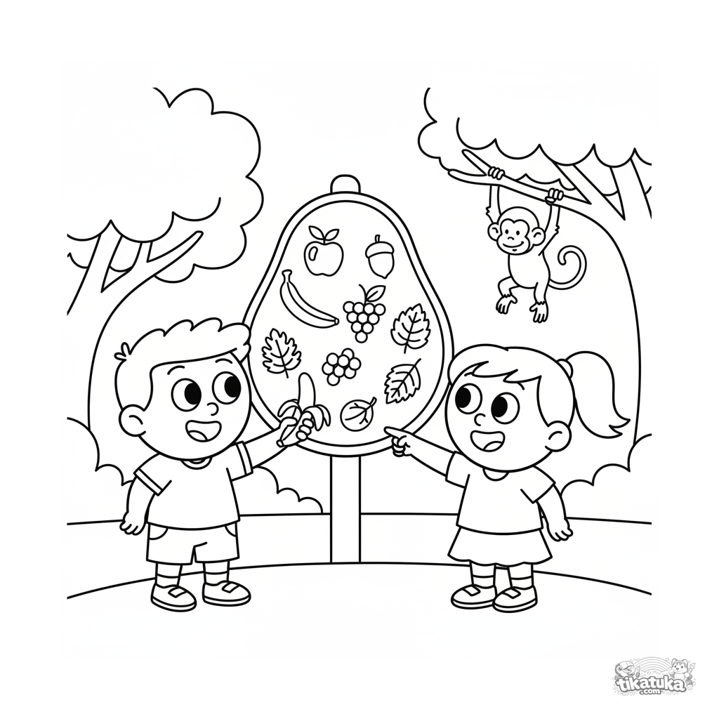 Coloring page for ages 7-9: two kids compare a real banana to a colorful monkey diet chart at the zoo enclosure. Educational scene about animal food.