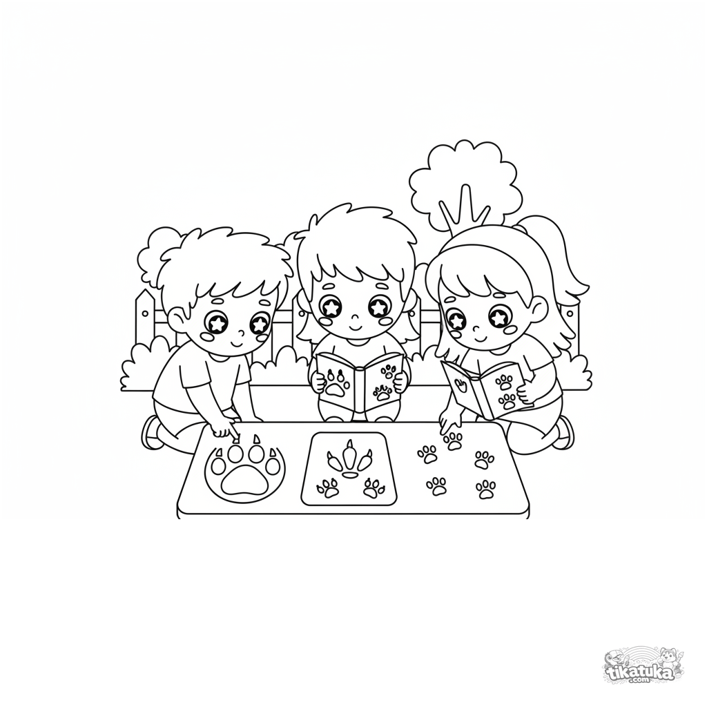 Coloring page for kids 4-6: children studying and comparing different animal tracks on a special sign at the zoo. Bright flat vector style.