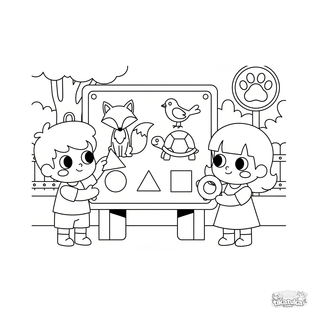 Coloring page for kids 7-9: a boy and girl at a zoo interactive board match geometric shapes to animal silhouettes. Develops logic and shape recognition.