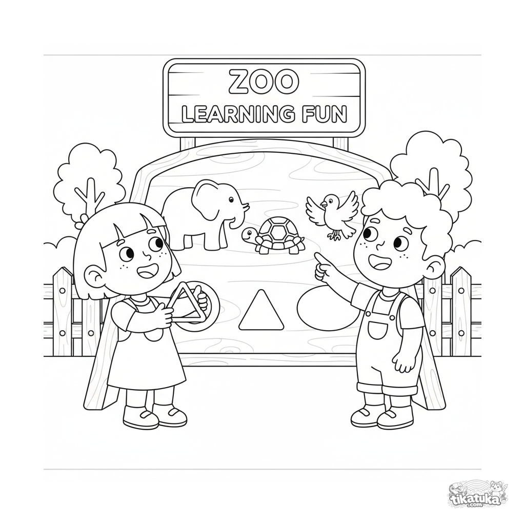 Coloring page for kids 4-6: children at an interactive zoo board, matching shapes to animal silhouettes. Educational game about forms.