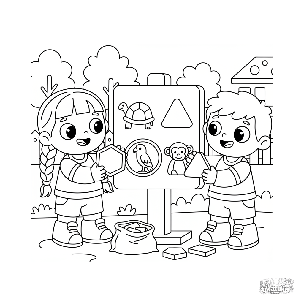 Coloring page for kids aged 7-9. Children play with an interactive zoo sign, matching geometric shapes to animal silhouettes. Scene for learning about shapes.