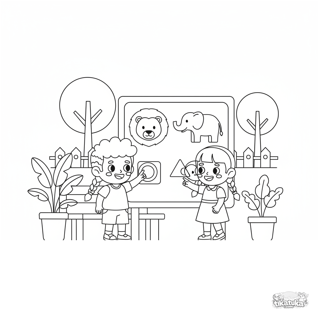 Coloring page for kids 7-9: two children play with an interactive sign, matching geometric shapes to animal silhouettes at the zoo. A dynamic scene about shapes and logic.