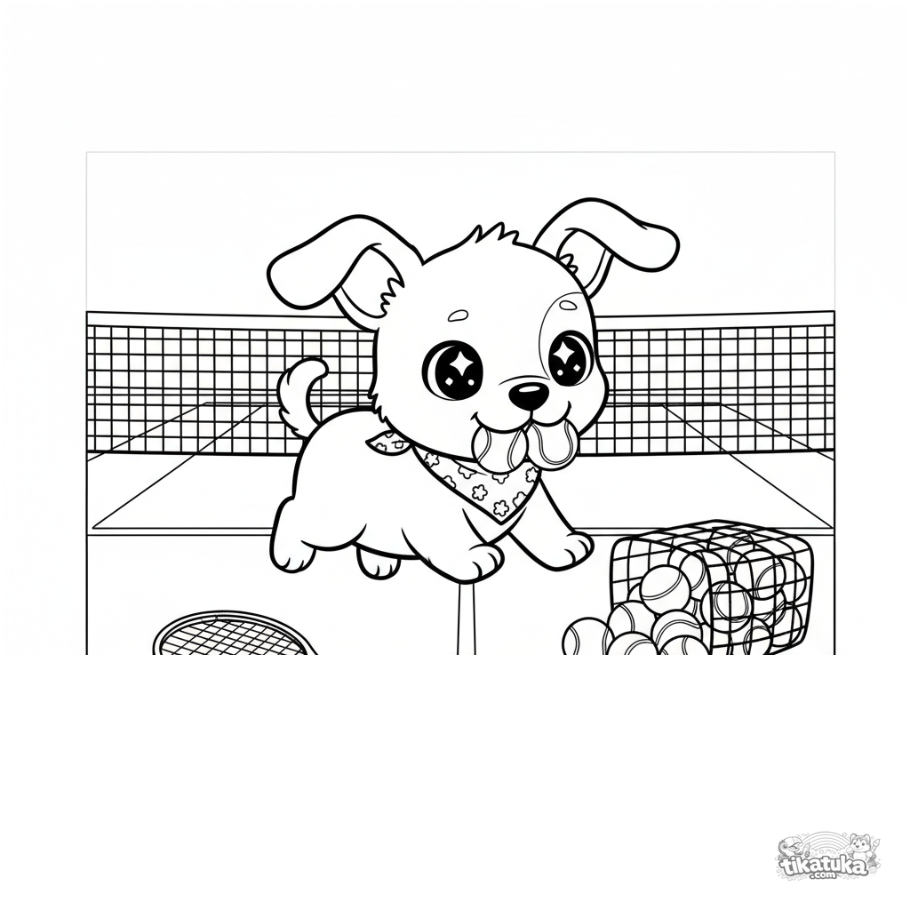 Coloring page for kids 4-6 years: a cute puppy runs across the tennis court collecting balls in its mouth. Funny scene with a basket and racket.
