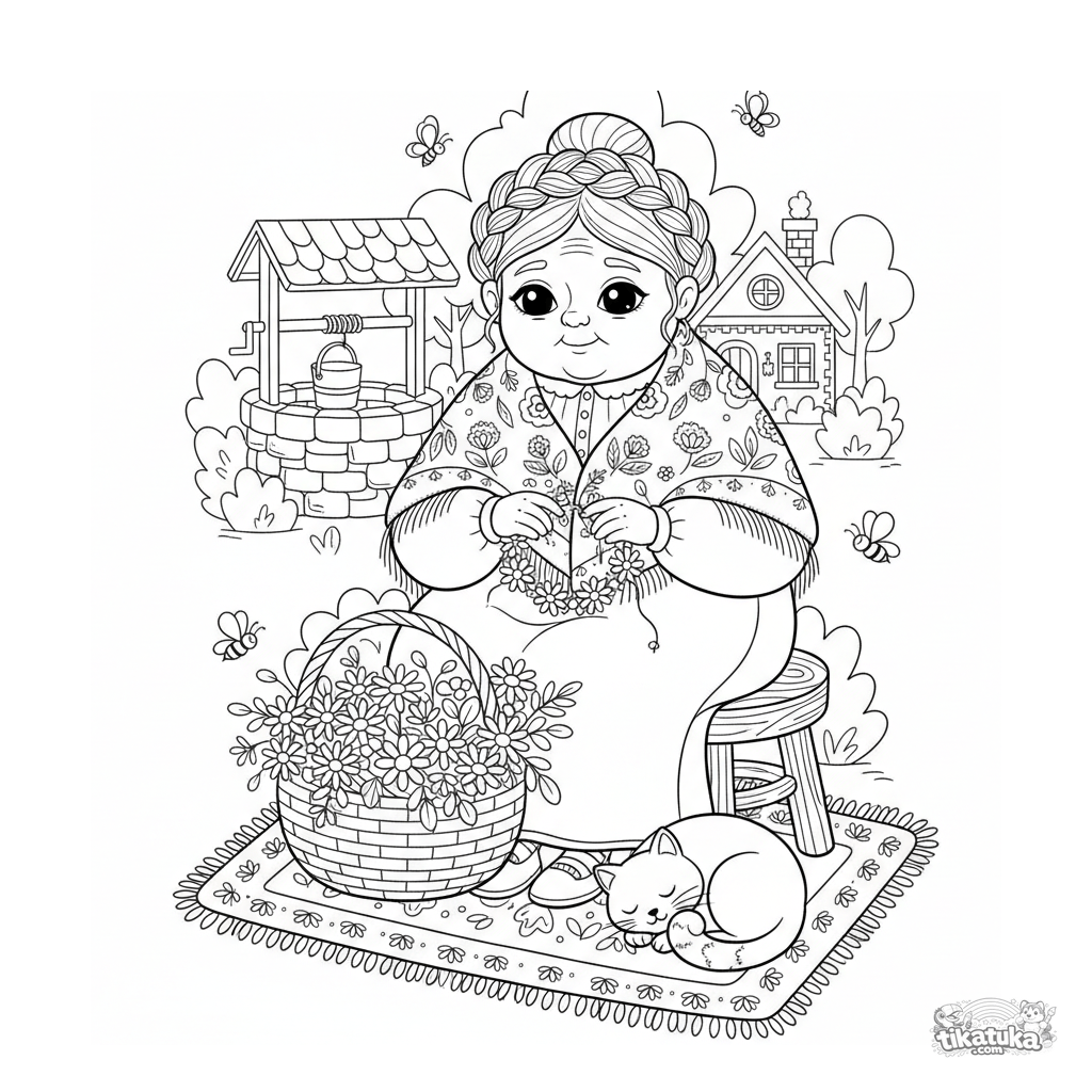 Coloring page for kids 4-6: a kind grandmother in a shawl weaves a flower garland by the well. Scene in folk embroidery style with flower basket and cat.