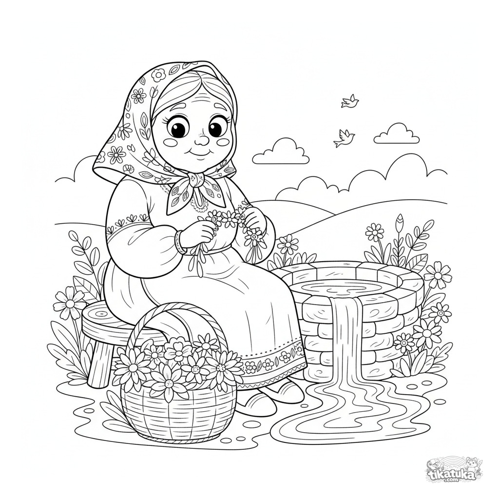 Coloring page for tweens 7-9: a kind grandmother in a headscarf weaves a flower garland by the well. Scene in embroidery-folk style with geometric patterns.