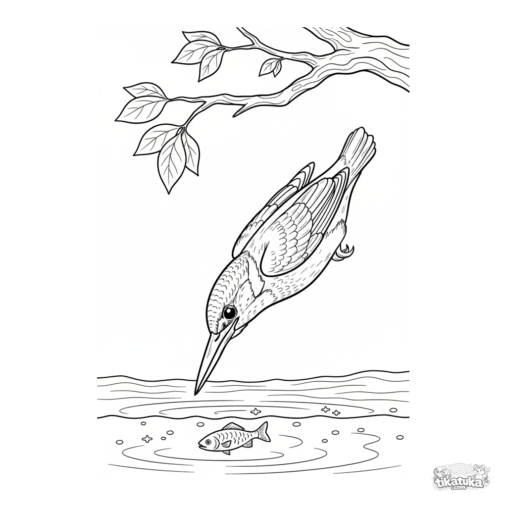 Coloring page for tweens 7-9: a kingfisher bird in a swift dive plunges towards a stream's surface after a fish. An action-packed bird-in-motion scene.
