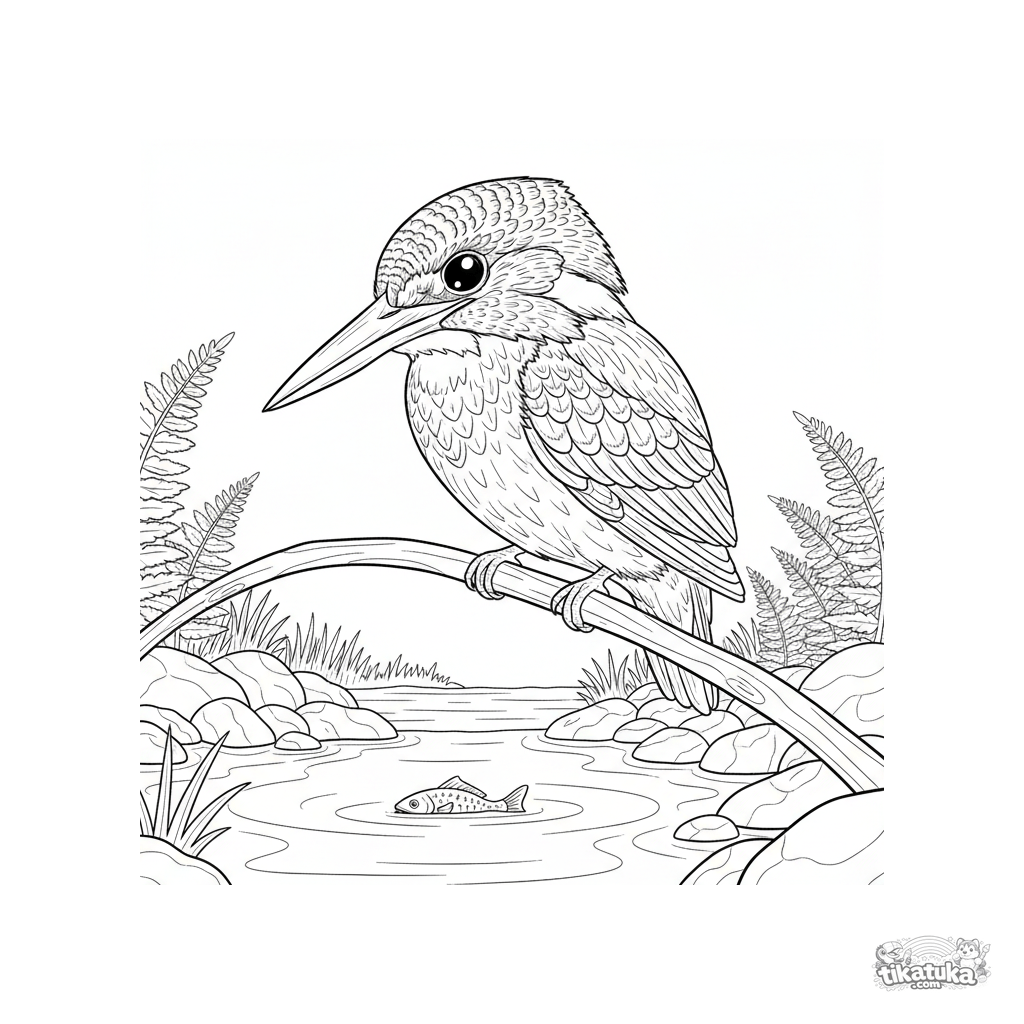 Detailed coloring page for ages 10-12: a kingfisher in its natural habitat on a branch over a stream. Realistic bird illustration with clean lines for precise coloring.