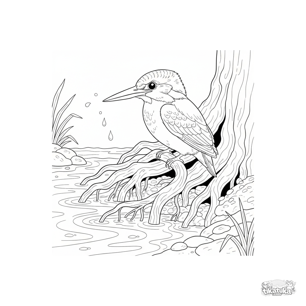 Coloring page for kids 4-6: a kingfisher with a long beak perches on willow roots over a clear stream, watching the water. Clear outlines, moderate detail.