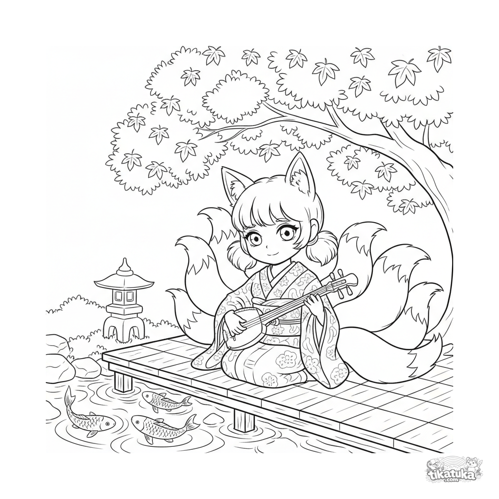 Detailed anime coloring page: a kitsune spirit girl with fluffy tails plays a traditional shamisen in an autumn garden. A complex scene with background for kids 10-12.