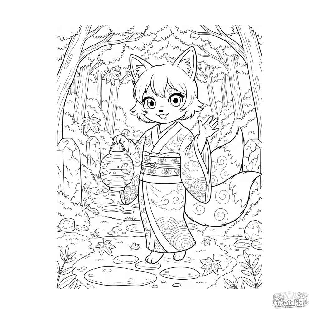 Detailed anime coloring page: a two-tailed kitsune spirit leads the way along an autumn forest path. For ages 10-12, with floating maple leaves, stone markers, and a glowing lantern.