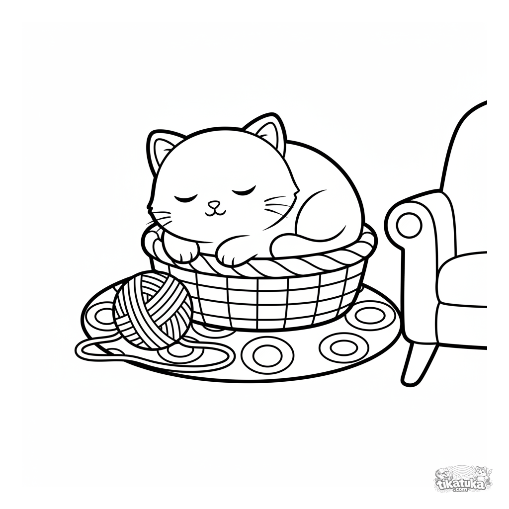 Simple coloring page for toddlers 2-3: a fluffy kitten sleeps soundly in a knitting basket next to a ball of yarn. Large shapes, minimal detail, perfect for first coloring attempts.