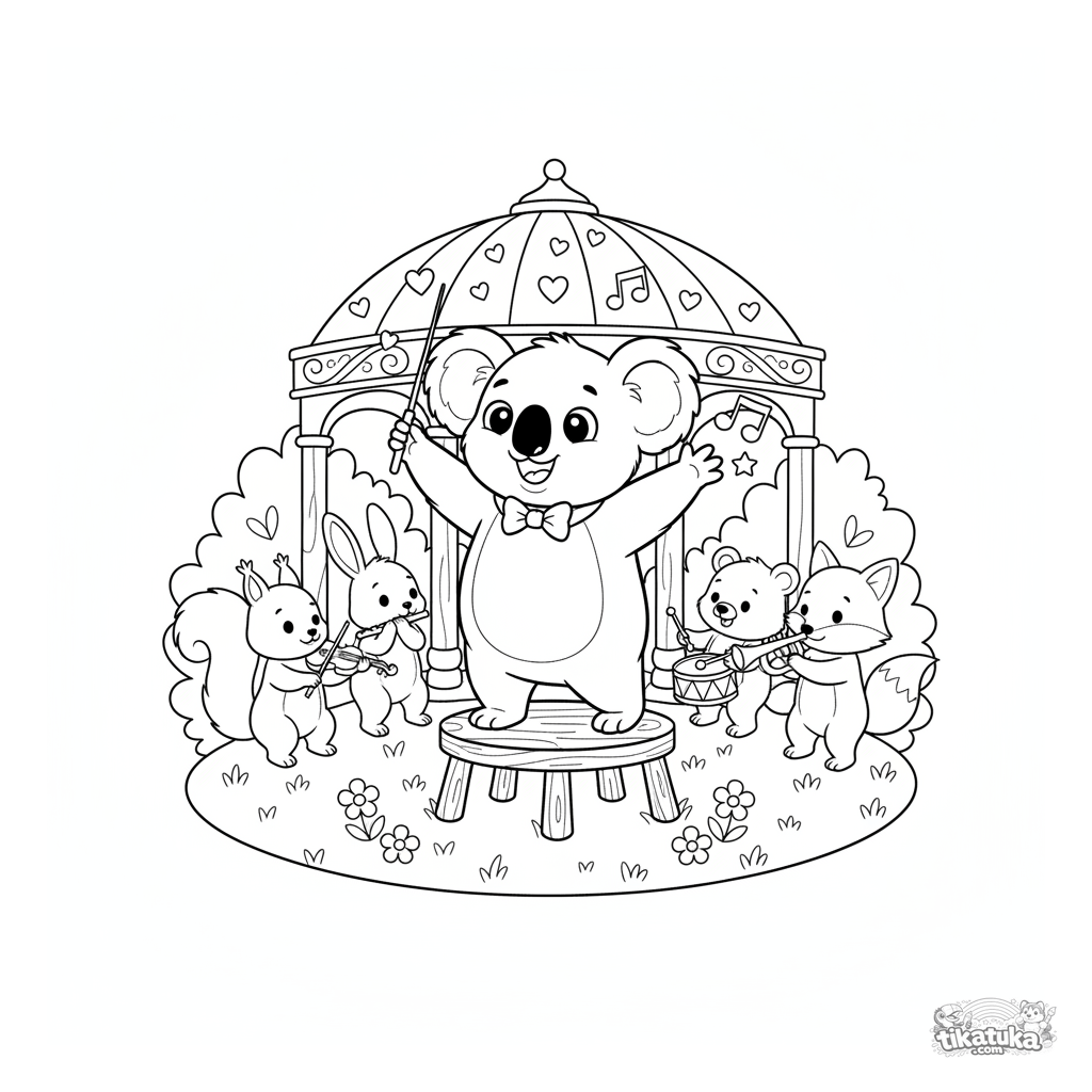 Coloring page for kids 4-6: a joyful koala conductor leads an animal orchestra in a park gazebo. Simple lines, recognizable characters.