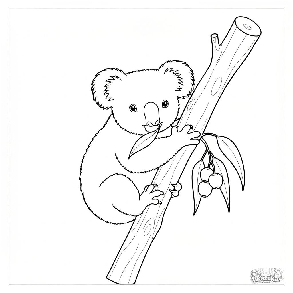Coloring page for kids: a koala sits on a eucalyptus branch eating a leaf. Simplified realism, for ages 3-5.