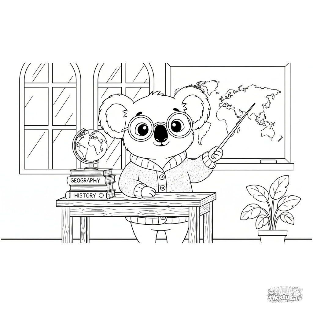 Coloring page for kids 4-6: a gentle koala teacher explains a geography lesson by a blackboard with a world map in a school classroom.