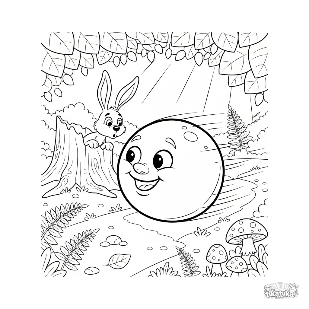 Coloring page for kids 4-6 from a Russian fairy tale: Kolobok is rolling cheerfully down a forest path, escaping from a surprised hare. A dynamic and recognizable scene.