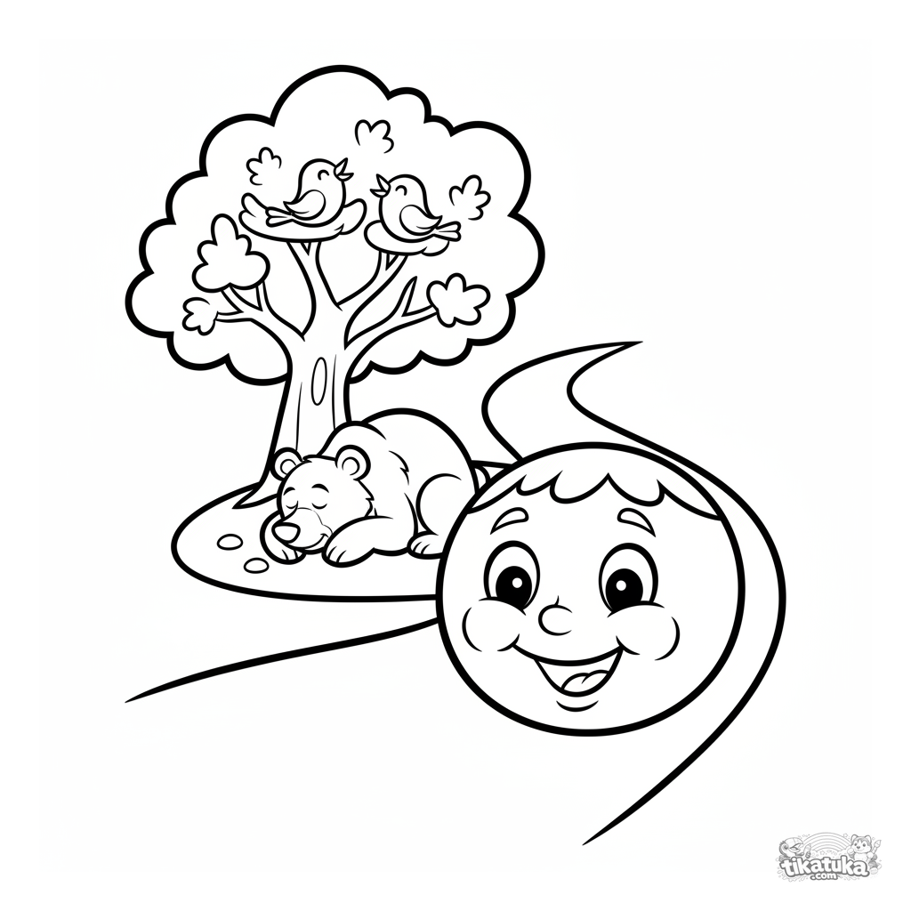 Simple coloring page for toddlers 2-3 years old with Kolobok from the fairy tale. Kolobok is rolling down a path past a sleeping bear. Large, simple shapes.