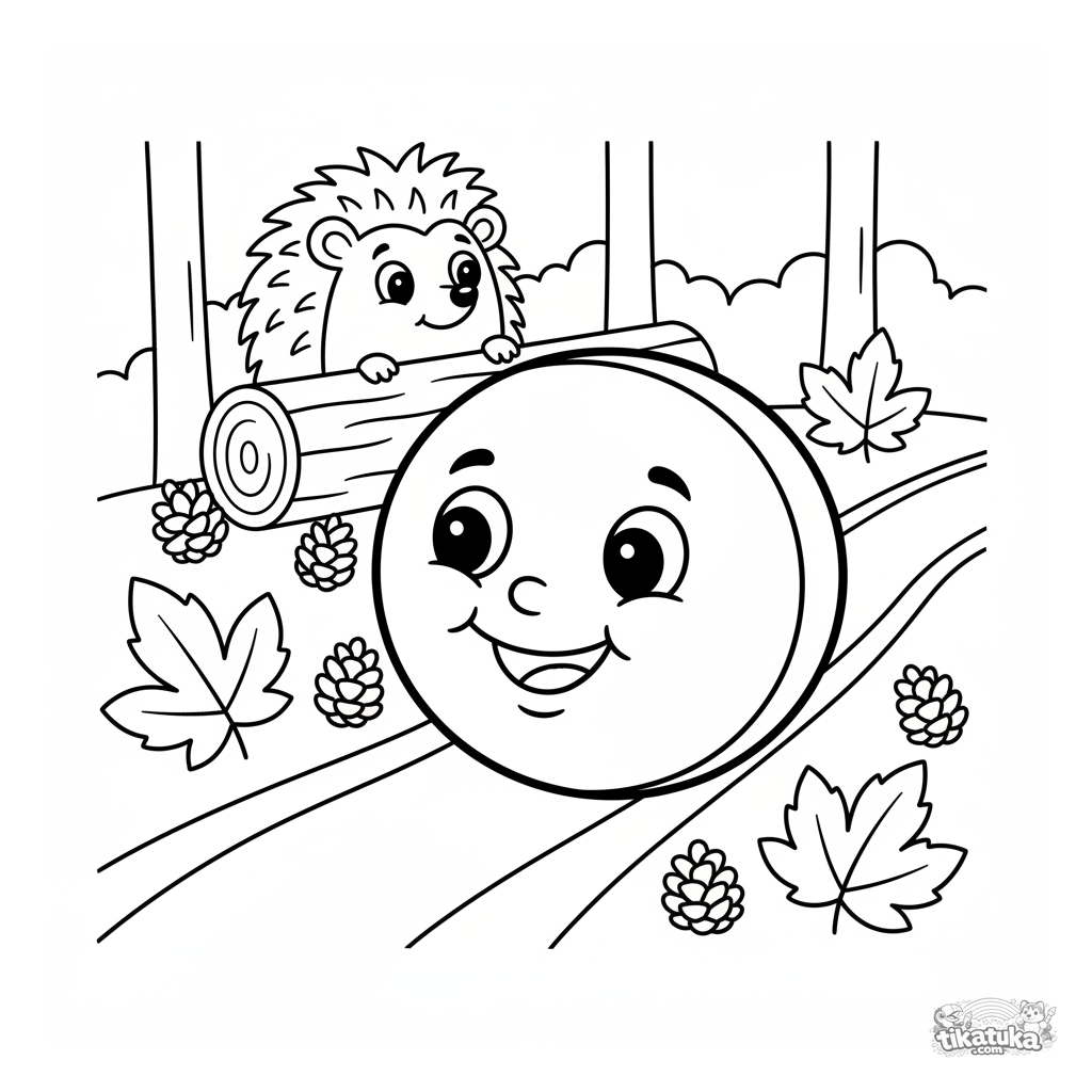 Toddler coloring page 2-3: cheerful Kolobok rolls down a winding forest path past a watching hedgehog. Very simple, large shapes, perfect for first crayons.