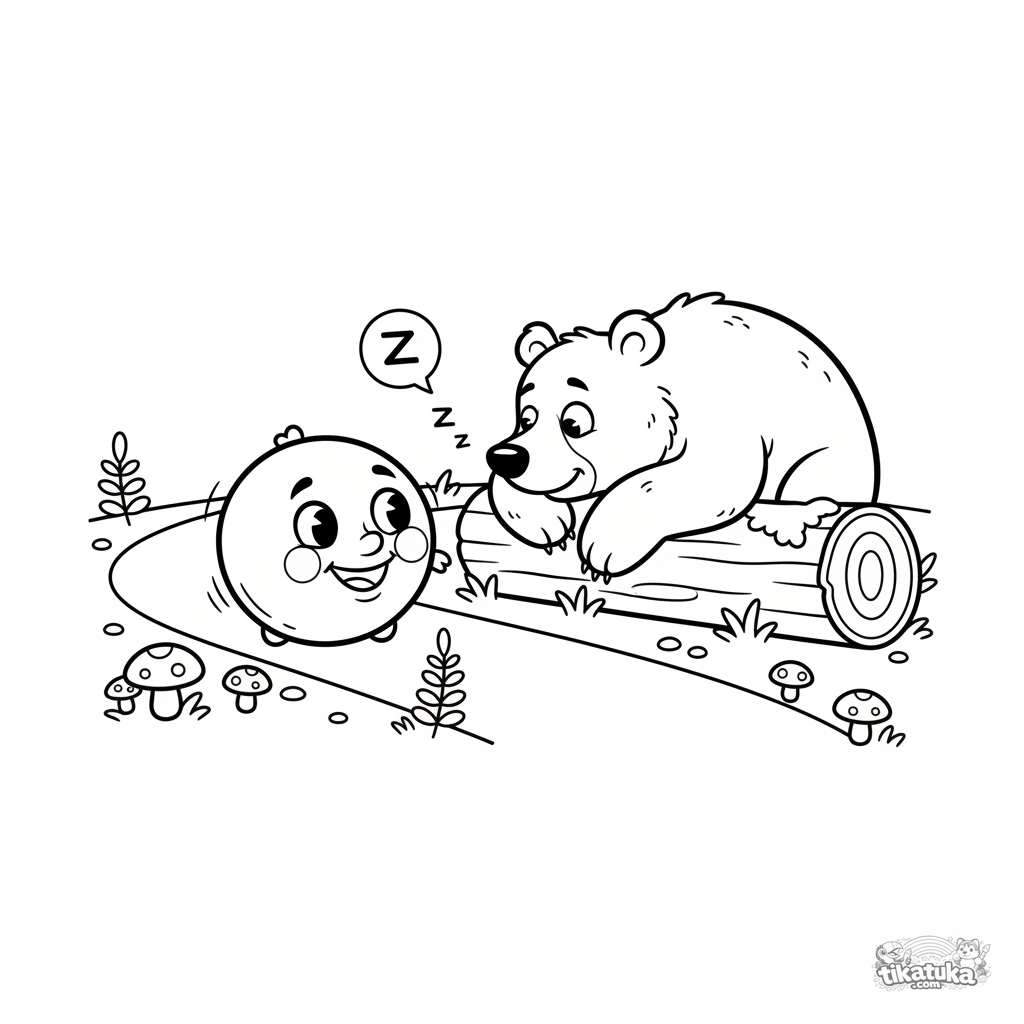 Simple coloring page for toddlers 2-3 based on the Kolobok fairy tale. Kolobok rolls down a path past a sleeping bear. Large simple shapes, wide margins.