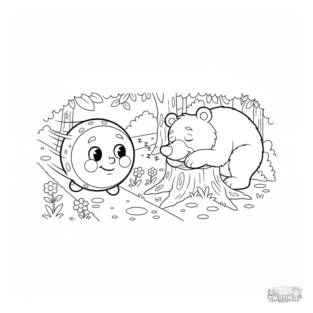 Coloring page based on the Russian fairy tale 'Kolobok'. The round hero rolls past a sleeping bear on a forest path. For kids aged 4-6. Familiar and fun scene.