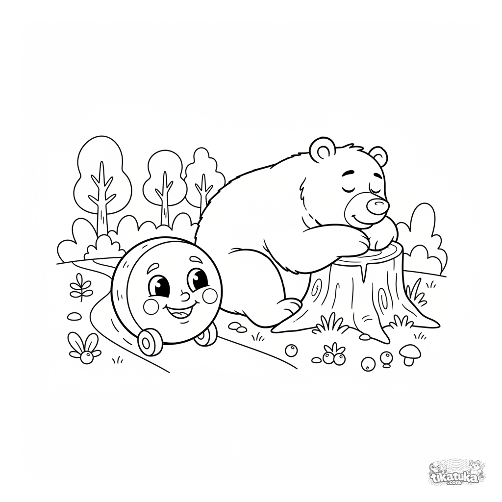 Coloring page from a Russian fairy tale for kids 4-6: Kolobok rolls through the forest past a sleeping bear. A familiar and fun scene to color.