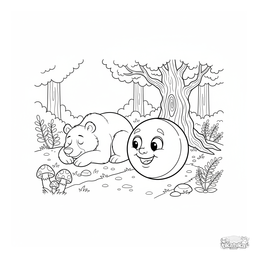 Coloring page from a Russian fairy tale: Kolobok rolling through the forest past a sleeping bear. For kids 4-6, introduces folk storytelling.