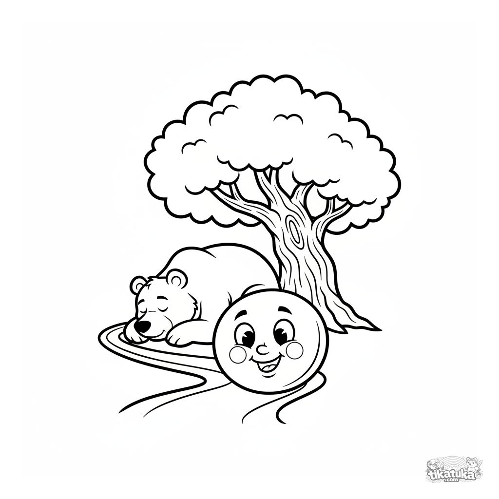 Simple coloring page for toddlers 2-3: Kolobok rolling down a forest path past a sleeping bear. Large shapes, few details, perfect for first coloring.
