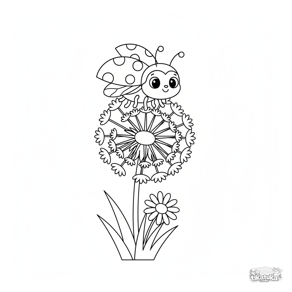 Simple coloring page of a ladybug on a dandelion for toddlers 2-3 years old. Large, clear shapes with wide margins for coloring.
