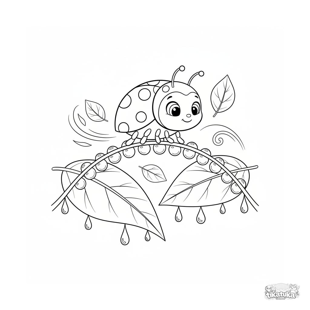 Coloring page for kids 4-6: a ladybug walks across a fragile bridge of dewdrops on a big leaf. A cute scene with details to color.