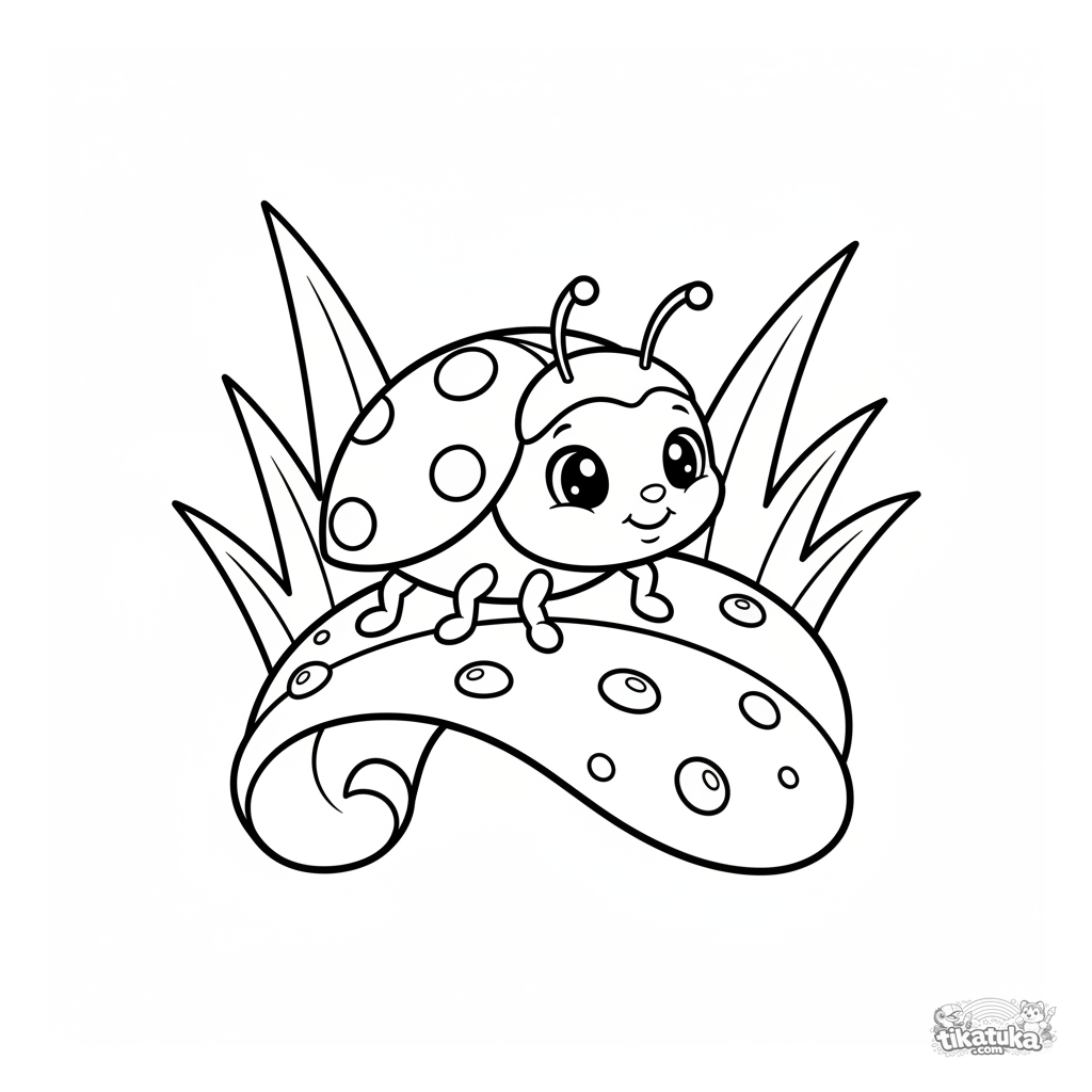 Simple coloring page for toddlers 2-3 years old featuring a ladybug on a leaf. Large shapes, clear outlines, perfect for first coloring skills.