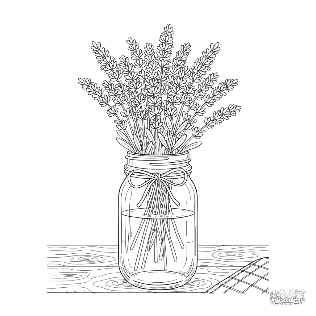 Intricate coloring page for ages 10-12: a realistic still life of a lavender bouquet in a mason jar on a table. High detail level.