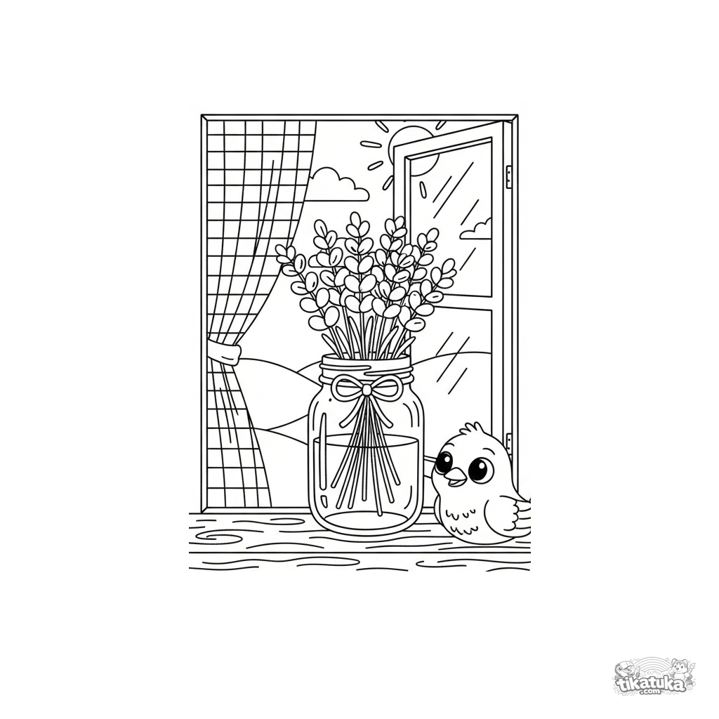 A coloring page for kids 7-9: a lavender bouquet in a mason jar on a wooden windowsill. Tied with twine, a curtain is visible, a cozy scene with moderate detail.