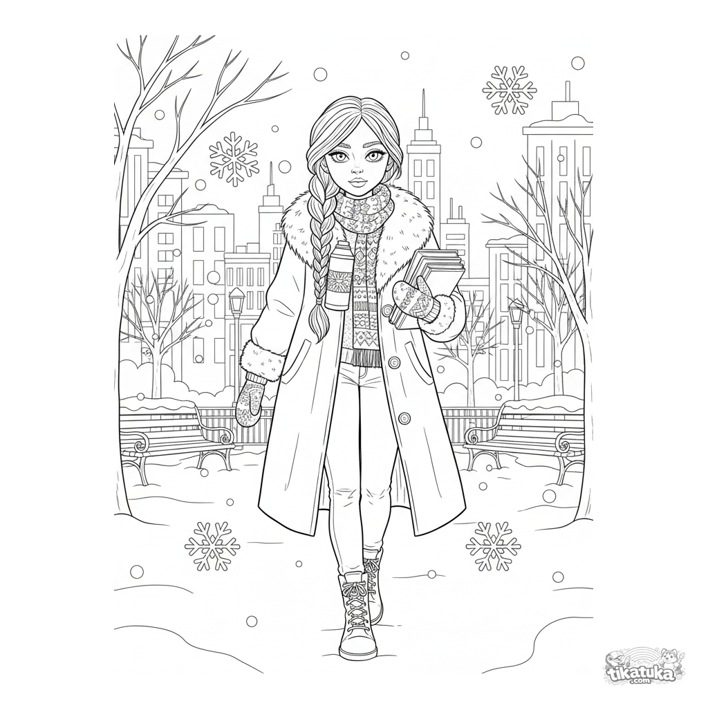 Detailed coloring page for ages 10-12: a layered winter outfit in a snowy park. A girl in a coat, scarf, with books and a thermos. Background with trees, benches, and city lights.