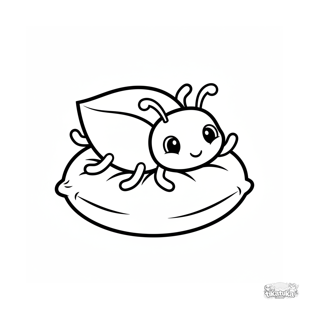 Simple coloring page for toddlers 2-3: a leaf-shaped bug lies happily on its back on a cushion. Flat shapes, minimal details.