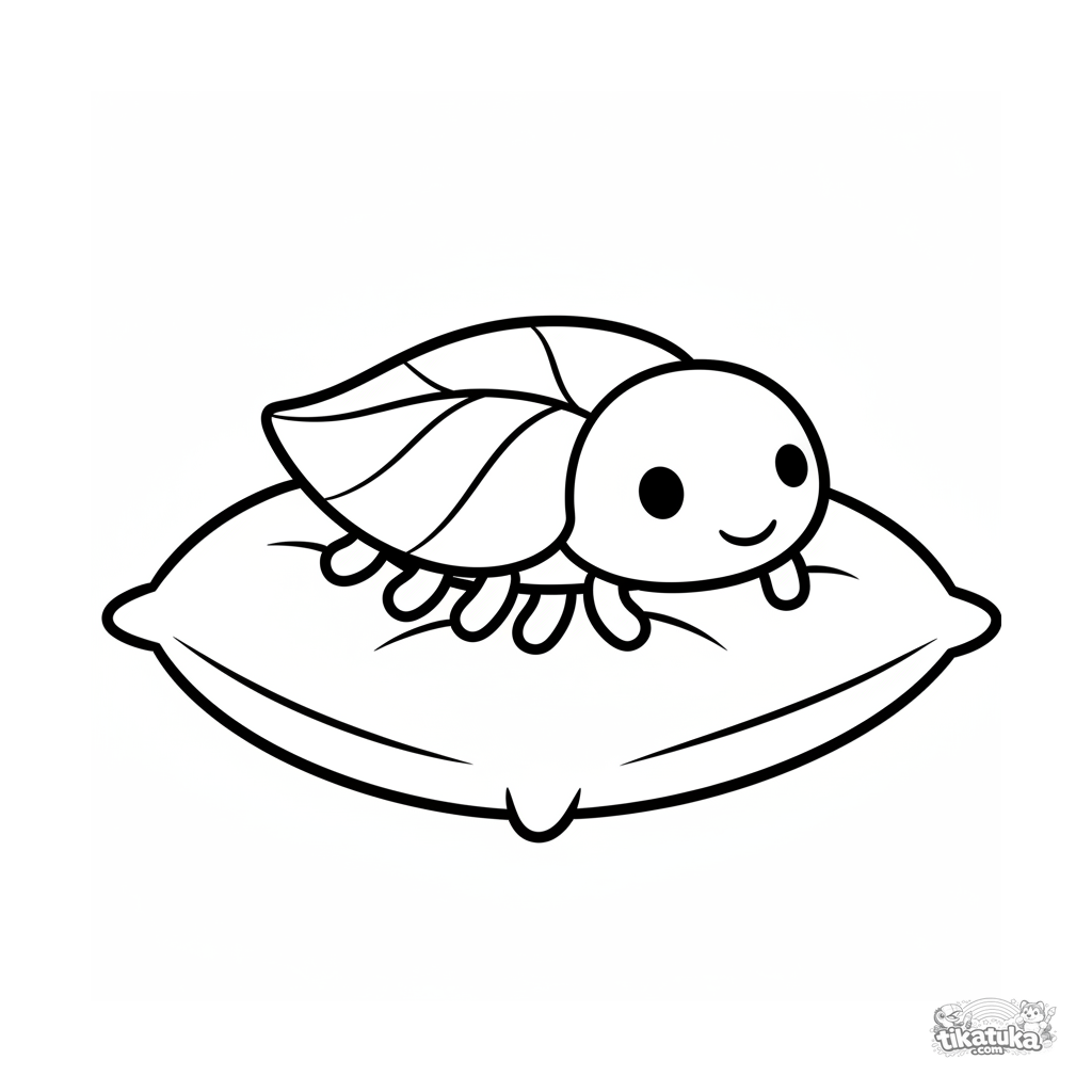 Coloring page for the very young: a bug shaped like a leaf sleeps on a pillow. Minimalist drawing with smooth lines for children 2-3 years old.