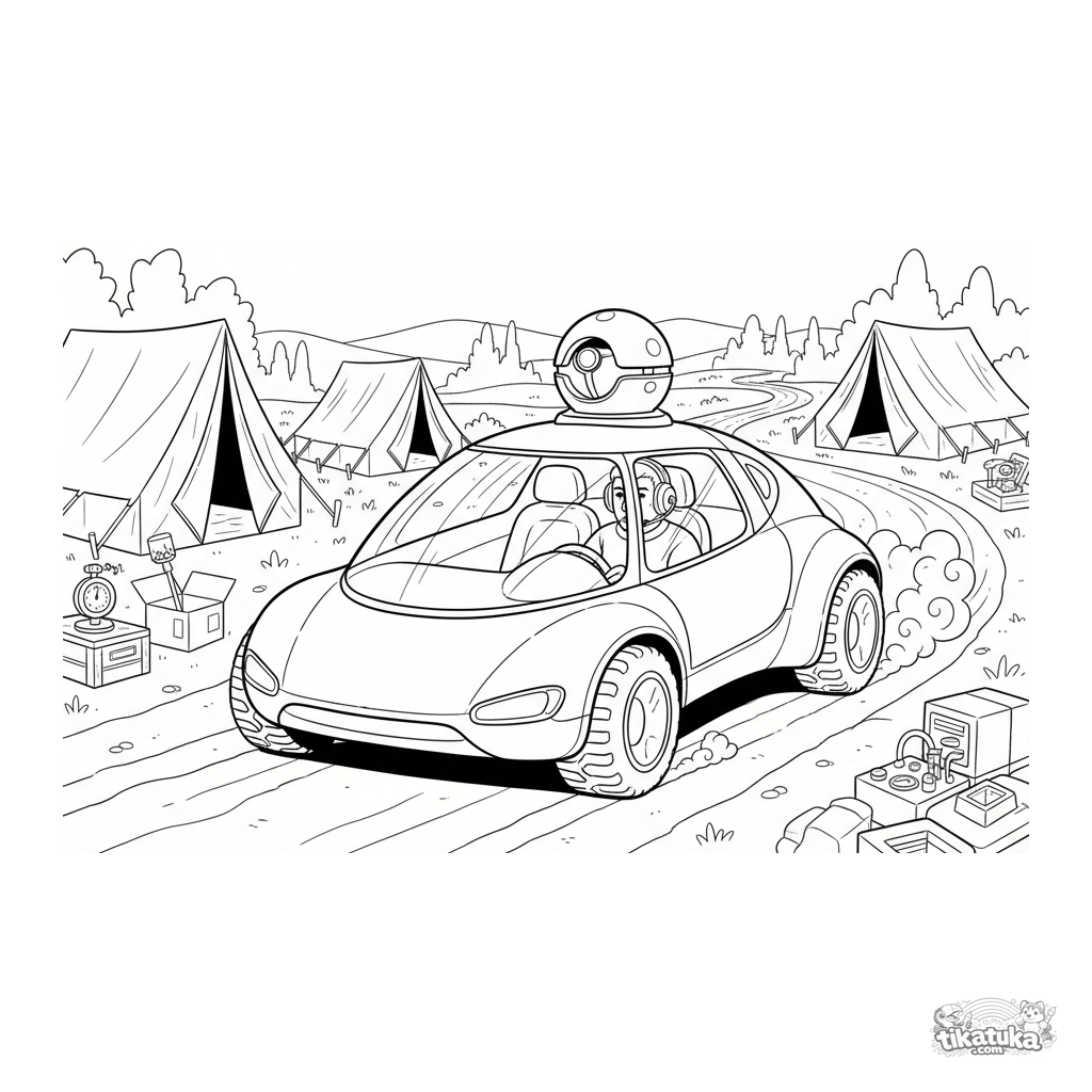 Coloring page for older kids 10-12: a detailed light reconnaissance vehicle on patrol between field tents. Driver with headset visible, sensor pod mounted.