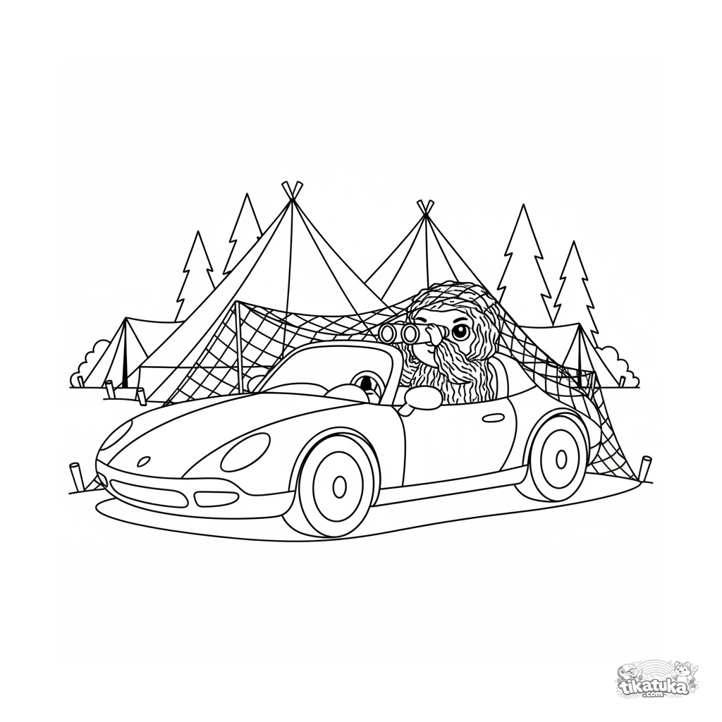Coloring page for tweens 7-9: a light scout car is hidden under camouflage nets at the edge of the field headquarters. A scout in a ghillie suit observes with binoculars.