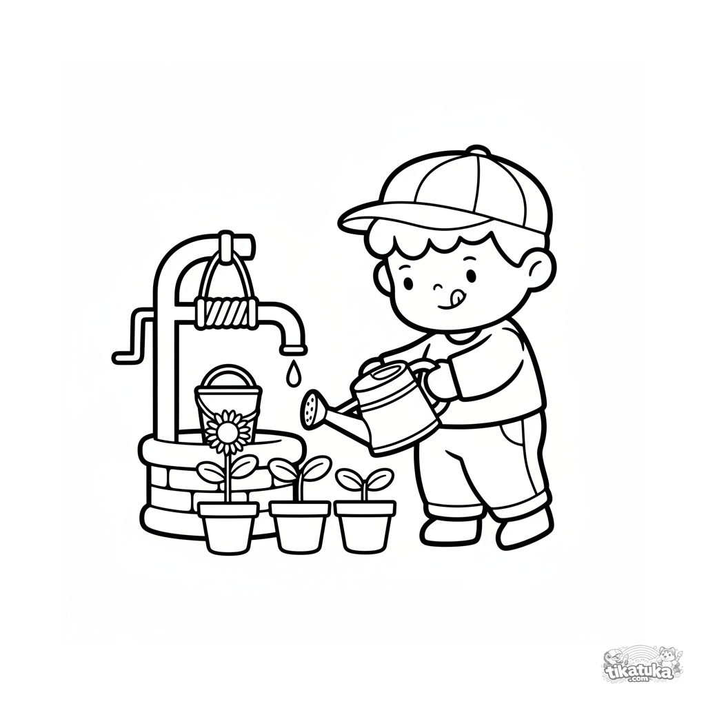Very simple coloring page for toddlers 2-3: a boy fills a watering can at the well. Geometric wooden-toy-like shapes, minimal details, and thick outlines.