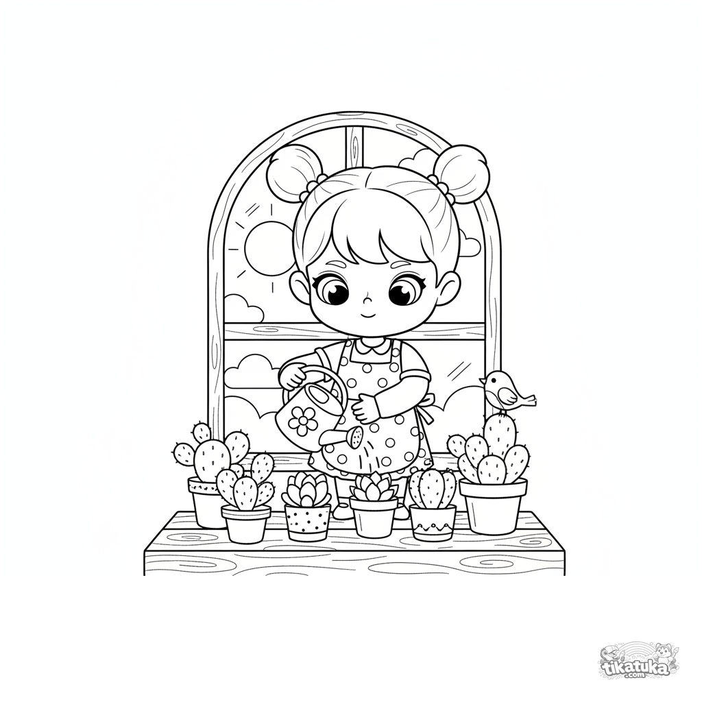 Coloring page of a little gardener girl watering her potted succulents on a windowsill. A sweet, calm scene for kids aged 4-6.