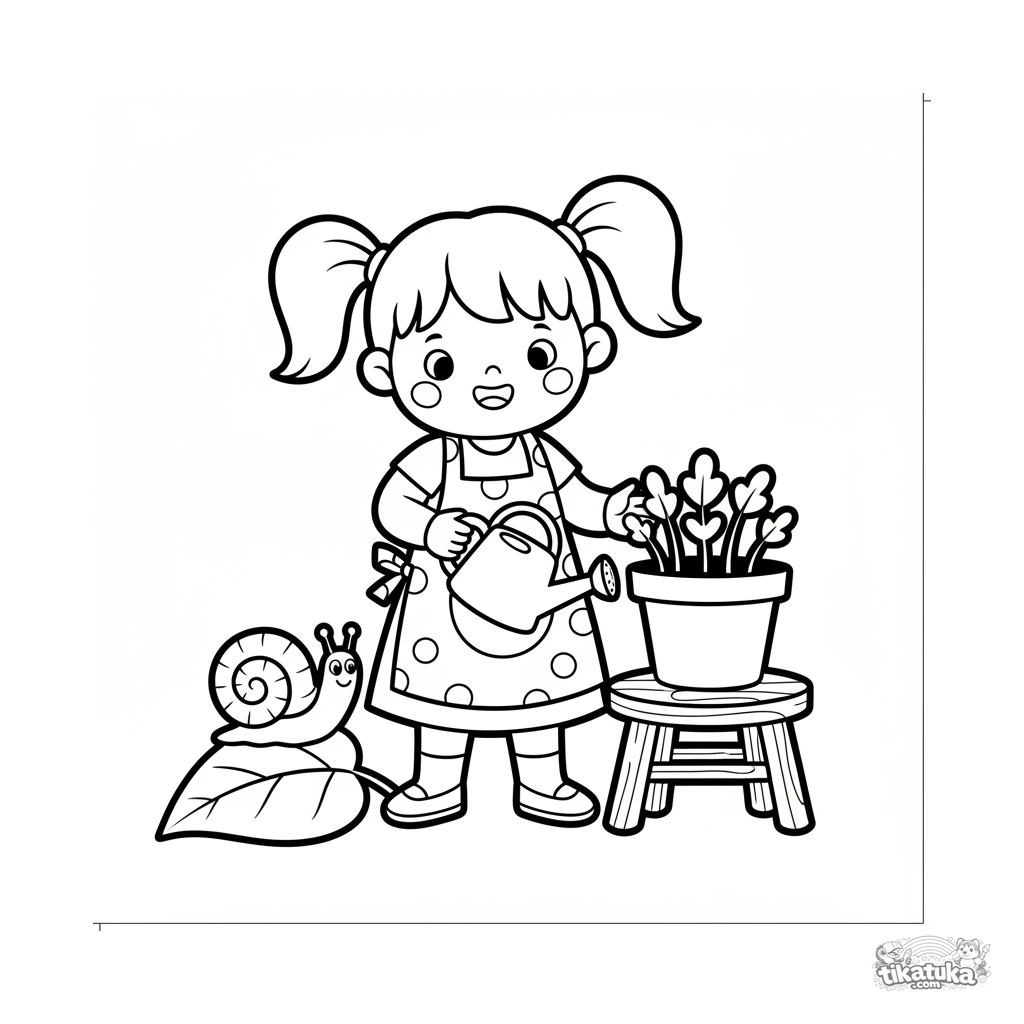 Toddler coloring page 2-3 years: a girl watering a plant in the garden. Very simple, large shapes with thick outlines, perfect for first crayons.