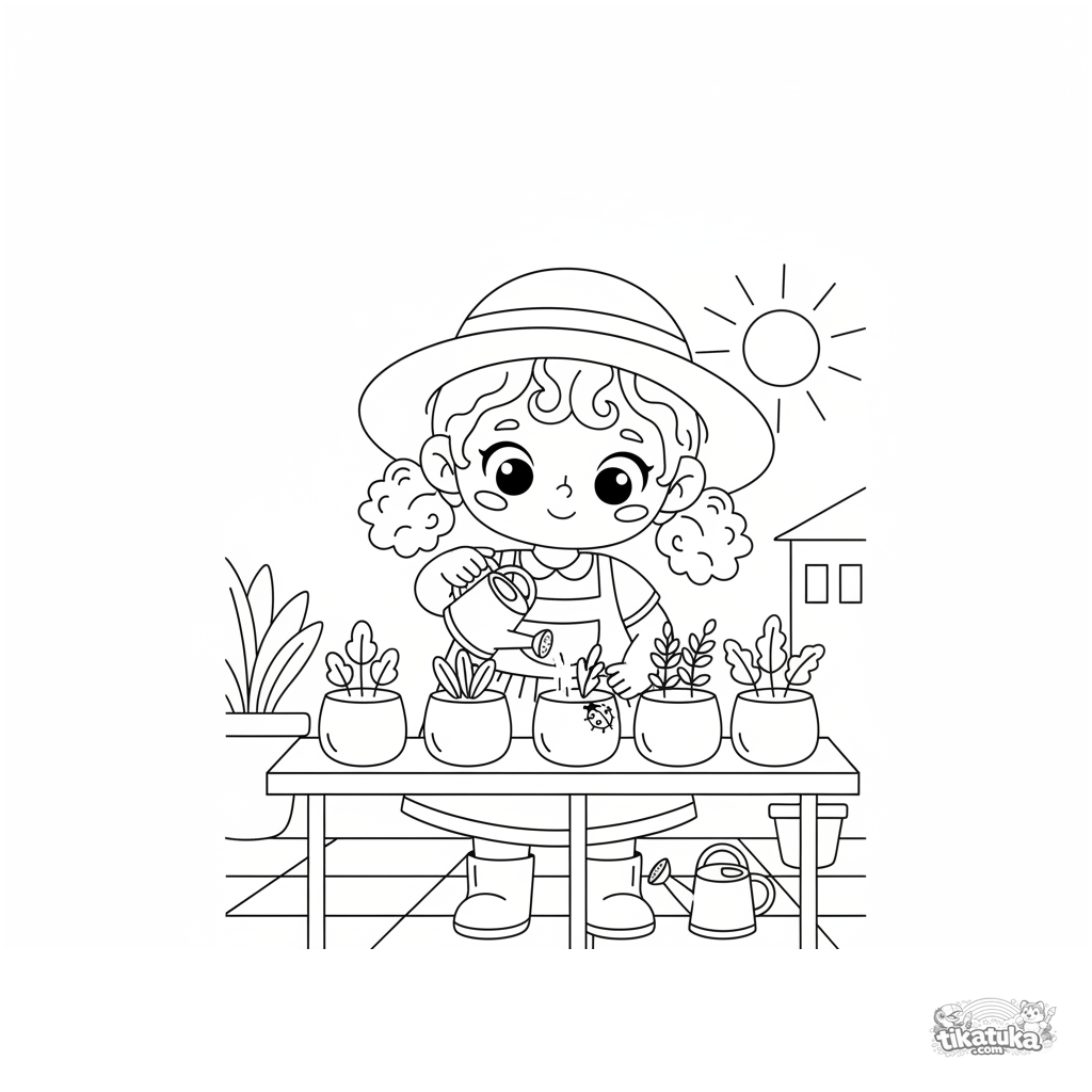 Simple coloring page for toddlers 2-3: a girl watering flowers on a balcony. Large shapes, minimal detail, perfect for first crayons.