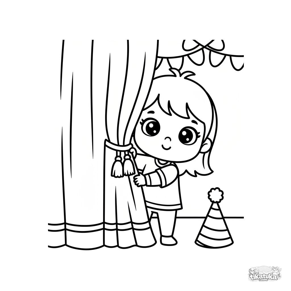 Very simple coloring page for toddlers 2-3: a little girl curiously peeks out from behind a stage curtain in a festive hall. Large shapes, minimal detail.