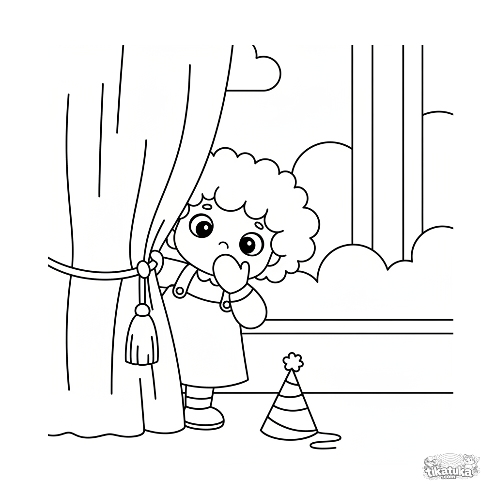Coloring page for toddlers 2-3: a little girl with curly hair peeks shyly from behind a festive curtain in a hall. Large simple shapes, wide margins.