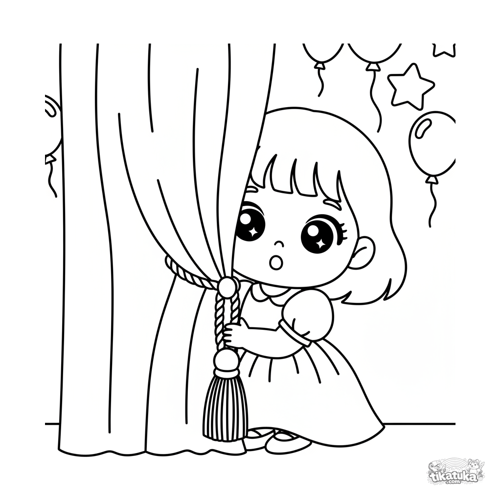 Toddler coloring page 2-3 years: a girl peeking curiously from behind a festive hall curtain. Simple, large shapes with few details.