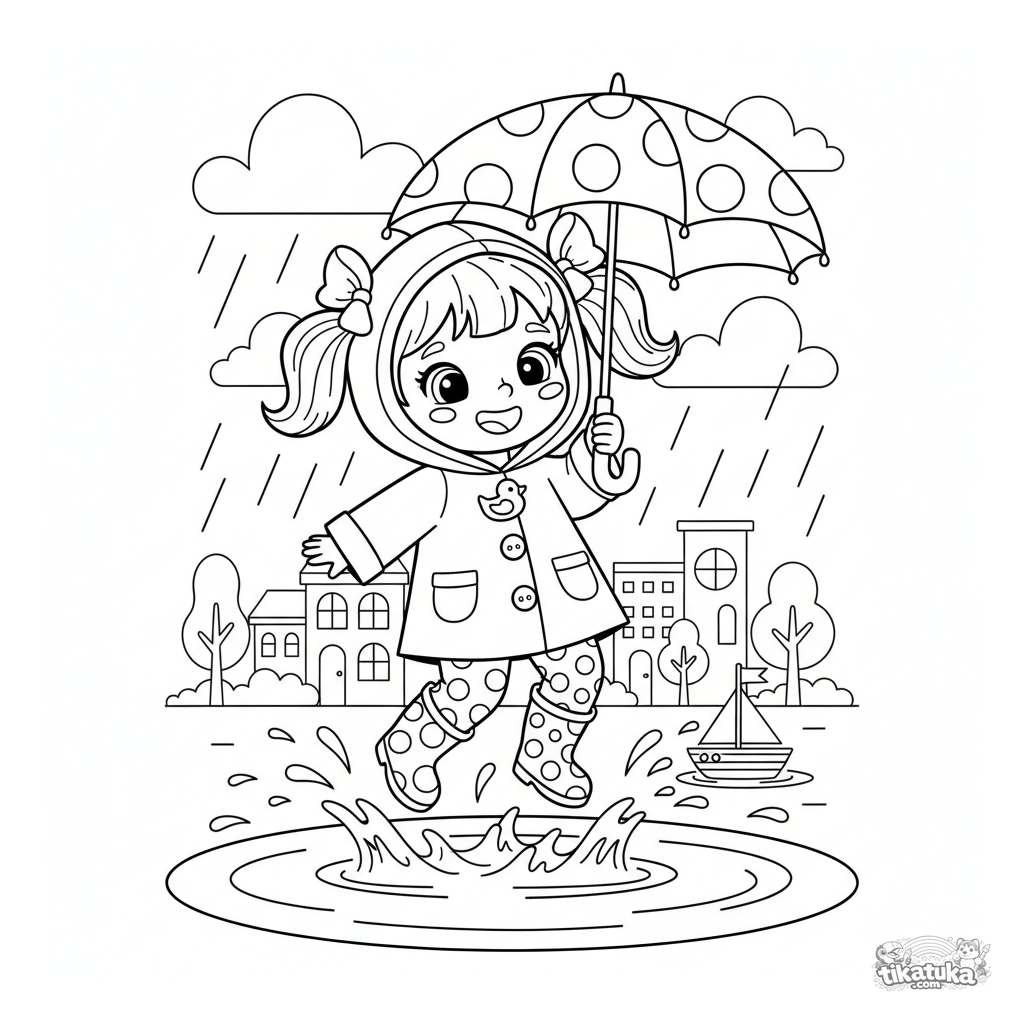 Fun coloring page for girls 4-6: a little girl in a raincoat jumps in a puddle in the rain. A bright, simple scene develops imagination and creative skills.