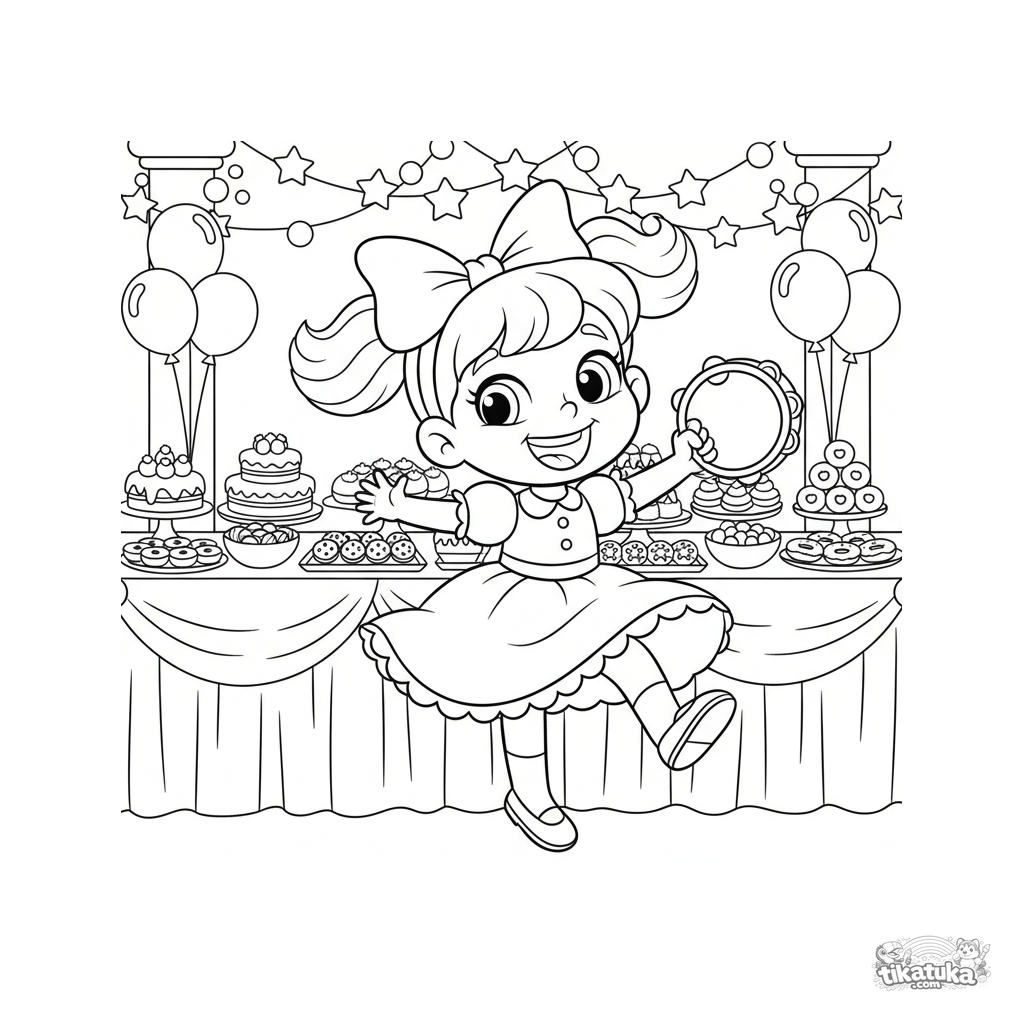 Vibrant coloring page for kids 4-6: a girl dances joyfully with a tambourine near a buffet table in a decorated hall. Dynamic and happy scene.
