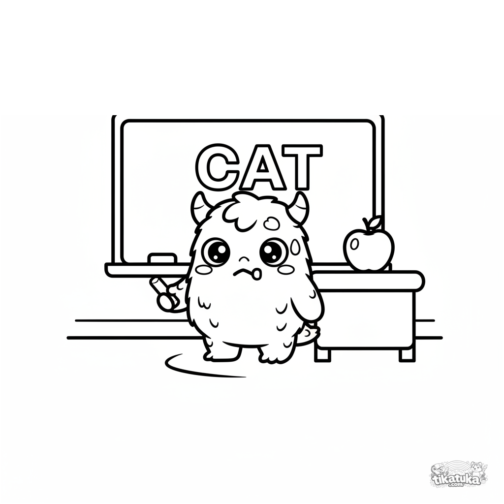 Toddler coloring page 2-3: a cute fluffy monster student stands at the school blackboard. Huge eyes, simple outlines, very few details.