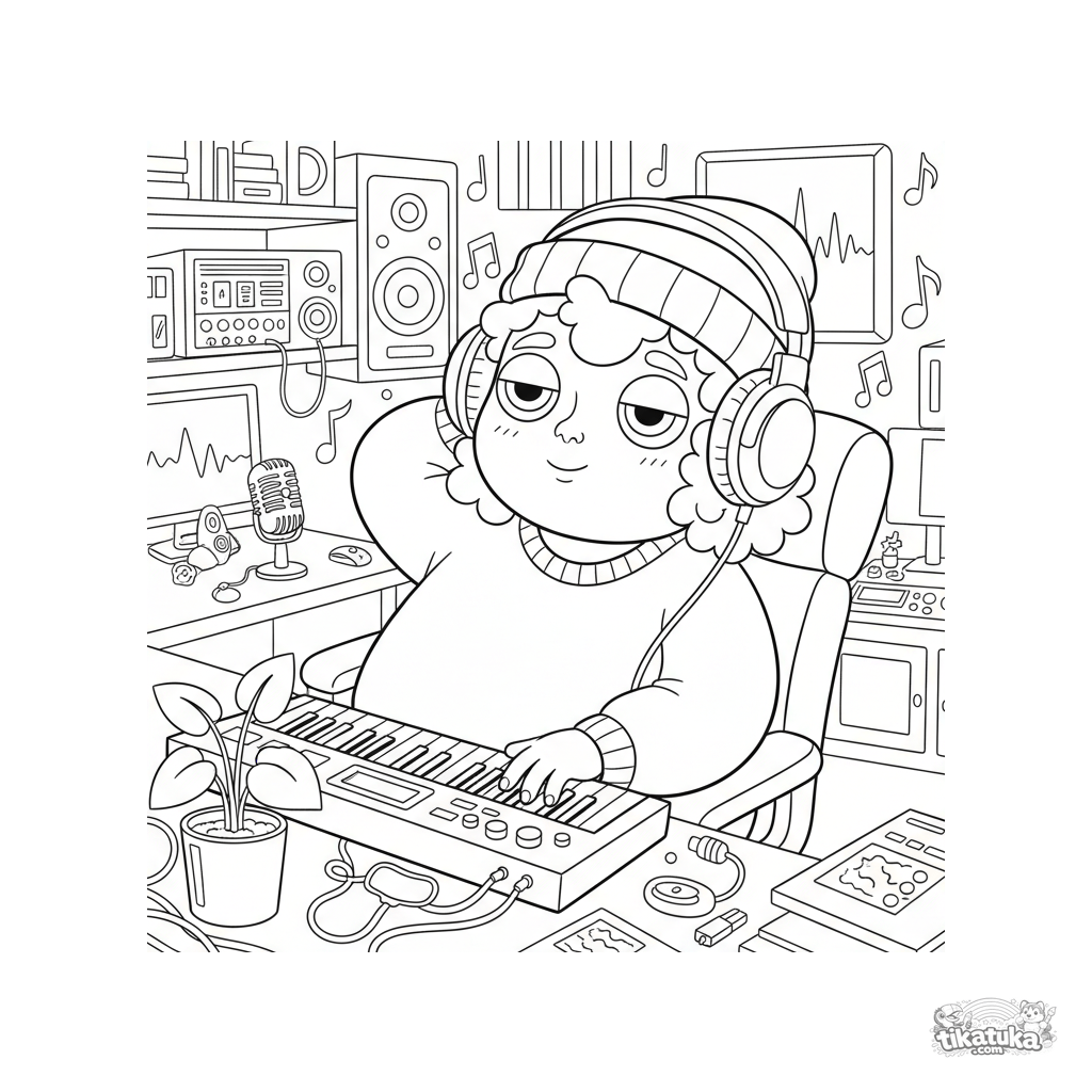 Coloring page for kids 10-12: a lofi music producer creating beats in a basement studio. Scene details include a MIDI keyboard, vintage mic, headphones, a plant, and soft lighting.